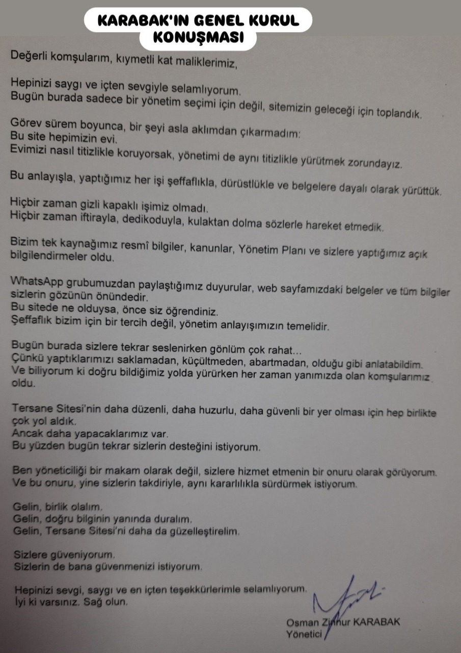 Dilek ve Temenniler bölümünde; Yönetici seçilmesinden dolayı Osman Zinnur KARABAK yaptığı teşekkür konuşmada “Bu zamana kadar faturasız işim olmadığı gibi, bundan sonrada faturasız asla hiçbir işim olmayacaktır. Denetçilerin dışında tüm kat malikleri defterleri istediği zaman inceleyebilir. Her şey şeffaf olacaktır. Sitemiz ile ilgili olumlu veya olumsuz tüm gelişmeleri “Tersane Sitesi” web sayfasından gerçekleri öğreneceksiniz. Rahat, huzurlu, güvenli bir yaşam için hep birlikte el ele daha güzel günlere..”dedi.