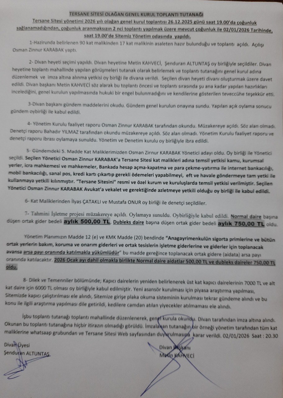 İşbu toplantı tutanağı toplantı mahallinde düzenlenerek, genel kurula okundu. Toplantı tutanağına genel kurul adına düzenlemek ve imza altına alma yetkisi oy birliğiyle verilen, Divan tarafından imza altına alındı. Okunan bu toplantı tutanağına hiçbir itirazın olmadığı görüldü. İmzalanan tutanağın “Tersane Sitesi” web sayfasından yayınlanmasına oy birliğiyle karar verildi. 06/01/2025 Saat : 20.30